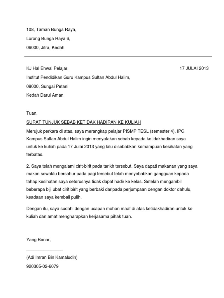 Surat Tunjuk Sebab Tidak Hadir Kuliah Latest Letter Website